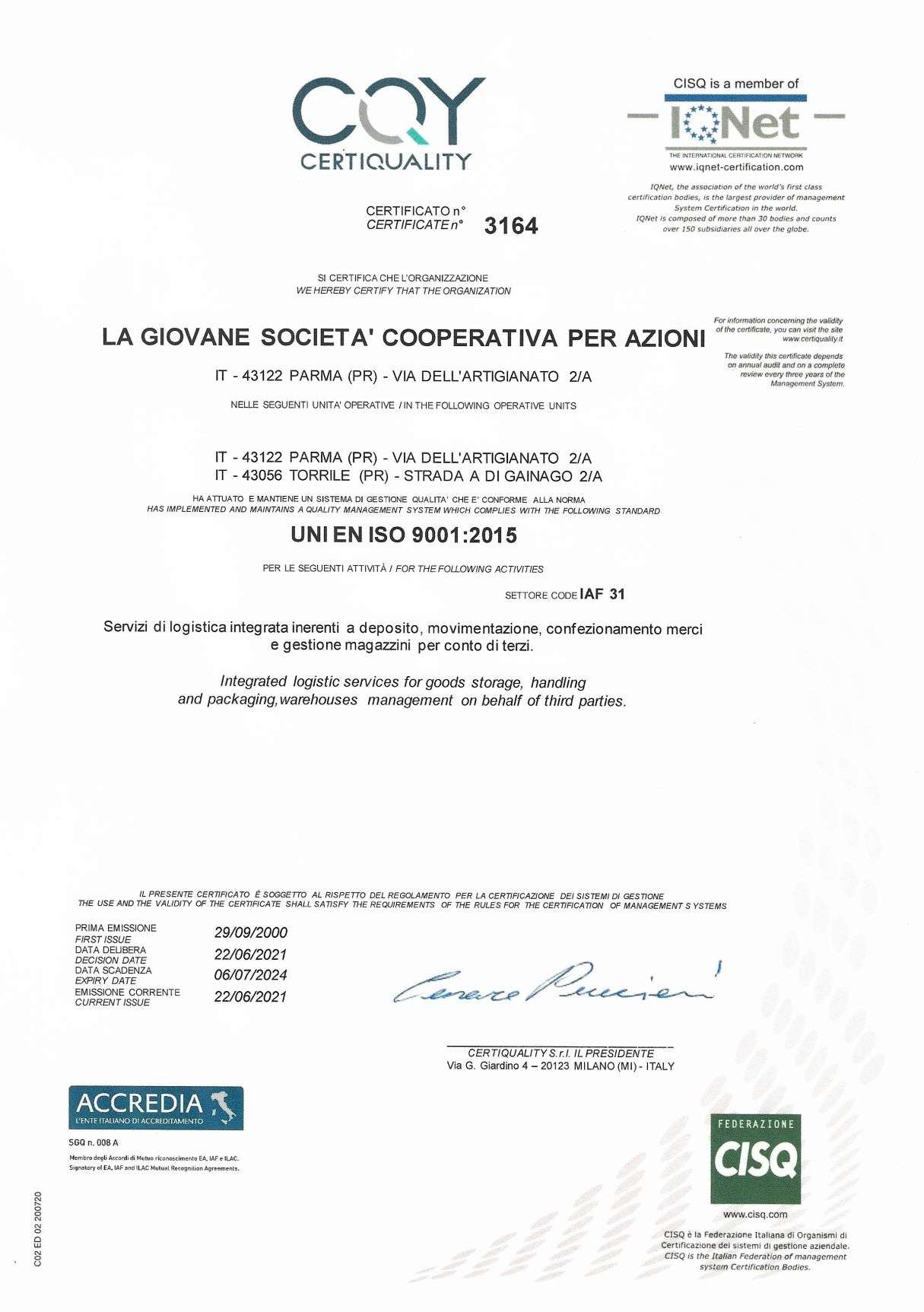 La Giovane has been certified to the ISO 9001 standard since 2000.